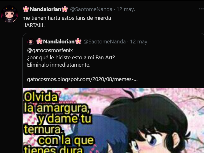 Debido a su manera de insultar públicamente para soltar a sus ratas y luego bloquear por un triste meme de doble sentido decidí resubir el mismo y dejarlo como entrada destacada del blog. Si fuera una adulta pudo enviarme un mensaje directo o e-mail pero acude a la cobardía publica y censuradora de twitter para llamar la atención como si fuera adolescente o feminazi. Que triste pensar que es alguien de mas de 30 años la que hace estos berrinches. Muchas veces según el contenido borro por peticiones privadas. Lo he hecho con trailers, openings etc; si se pide de una manera adulta (lo han hecho empresas), pero no como esta "niña" que solo quiere endiosarse a si misma. Hacer escandalo un simple meme de internet, que poco se valora. Y por cierto, su imagen la encontré en un grupo de telegram de HENTAI, pues ese tipo de contenido hace también por petición. Solo diré que debería reirse mas la pobre victima, no del meme, pero le falta reírse y menos berrinches.